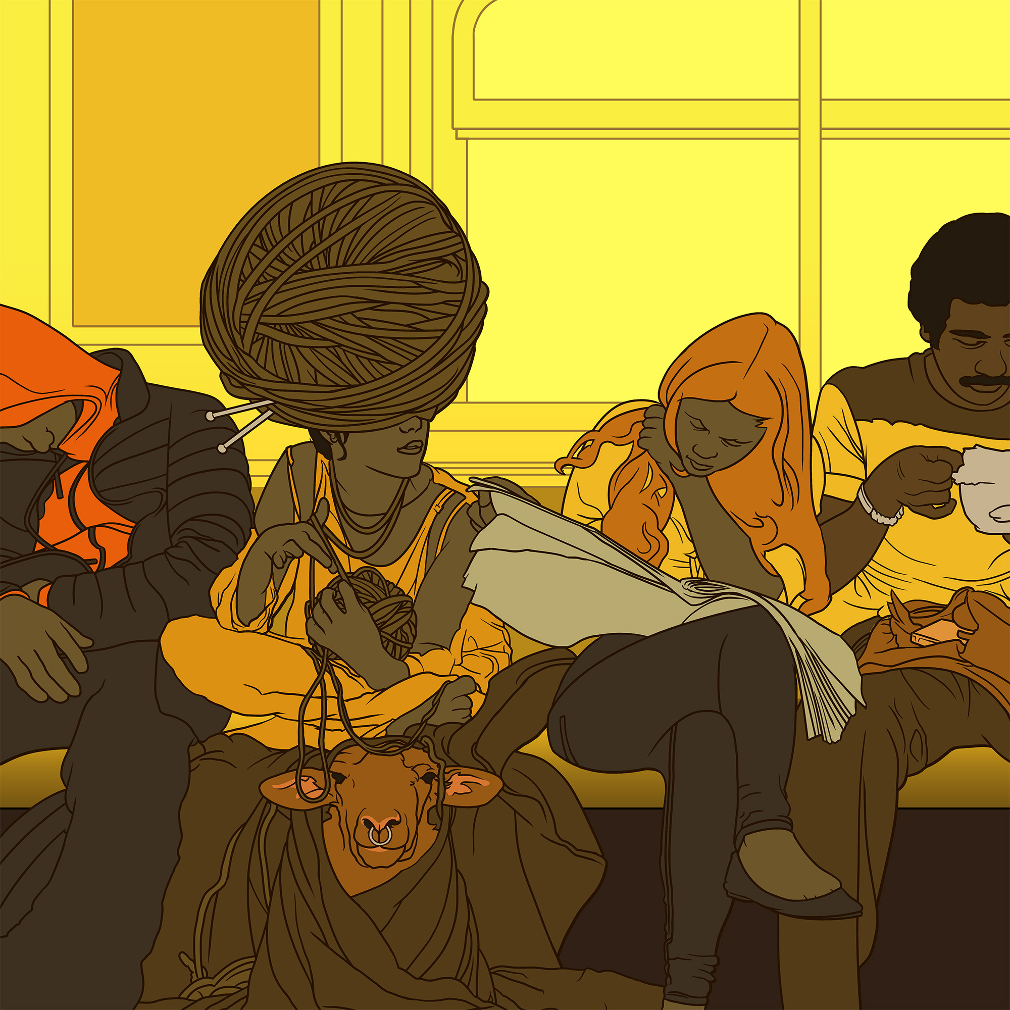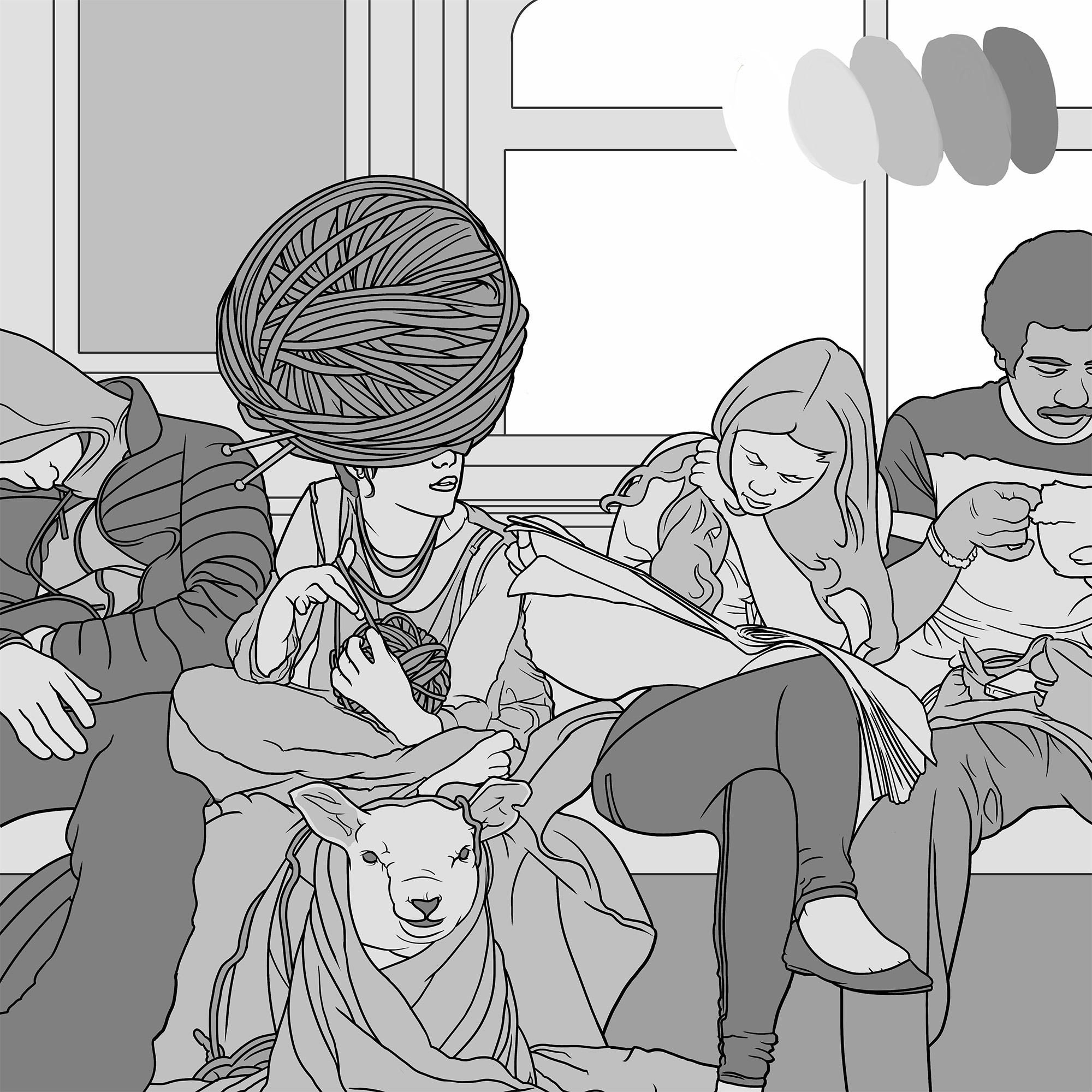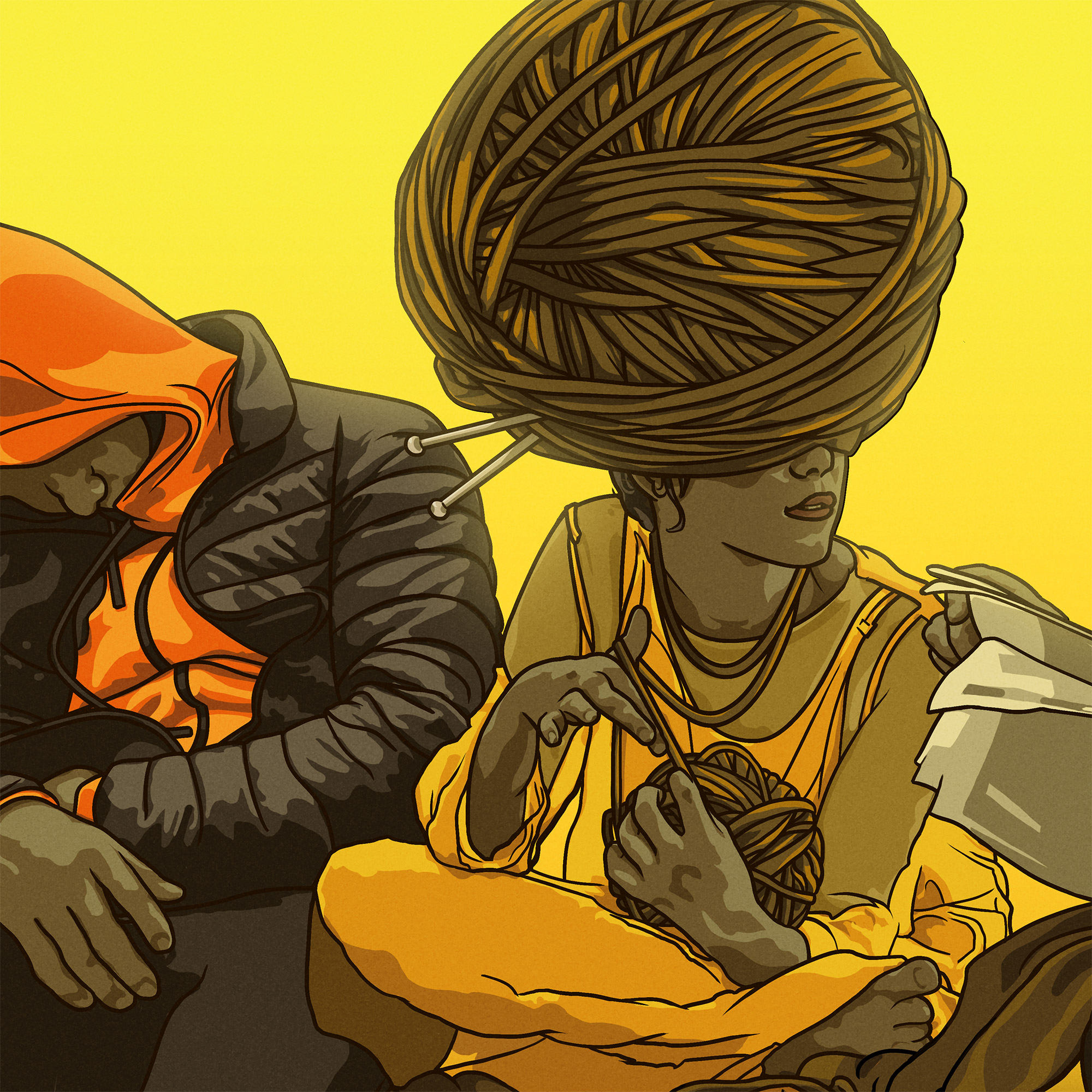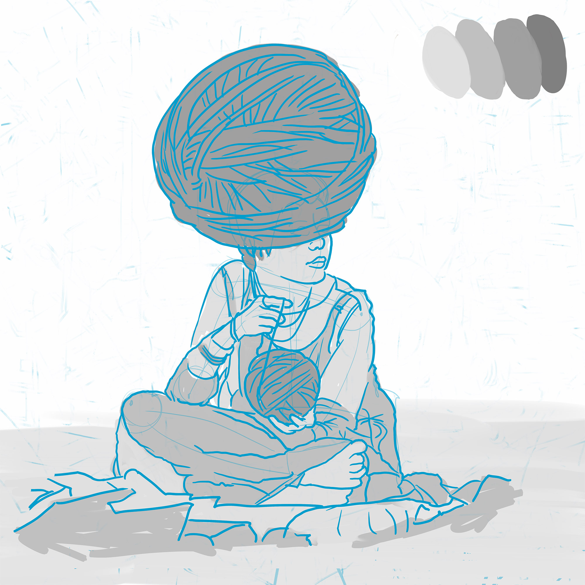 This piece started with a few sketches of a girl getting ready to knit with a few large balls of yarn in her lap. I’d originally planned to just tie her up in a giant spiderweb of strands, but as I redrew sections and moved the balls of yarn around, one accidentally moved over her head and become a hat, and the initial happy-accident concept was born.